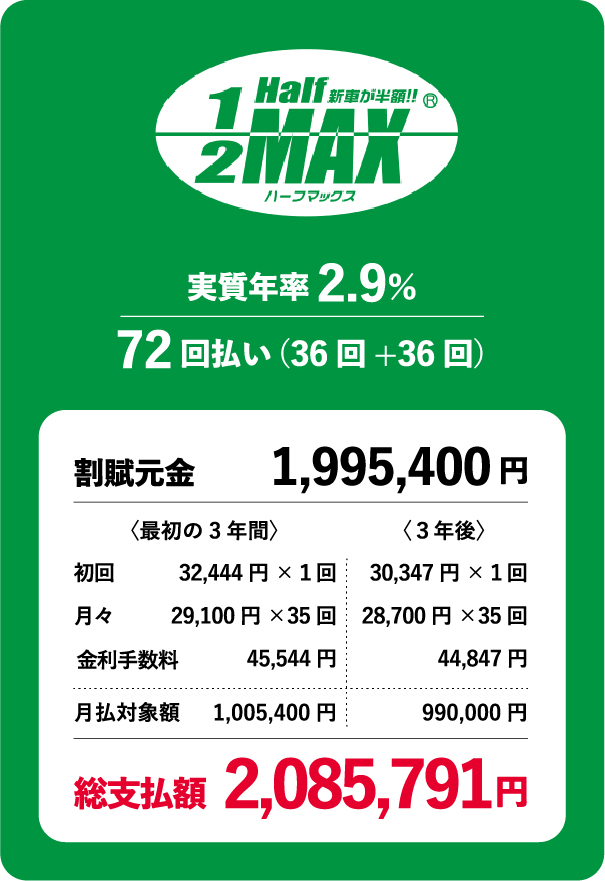 ハーフマックスは、税込車両本体価格の半額ずつをお支払いいただくことで、ローンの金利手数料を大幅に節約できるプランになります。