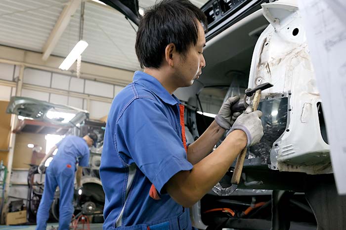 『車体整備士』は車体損傷修理のプロフェッショナル。自動車整備士資格とは異なり、国家資格である『車体整備士』資格を従業員の約半数が保持しておりますので、保険会社からの対応相談も多く、実績も豊富です。
