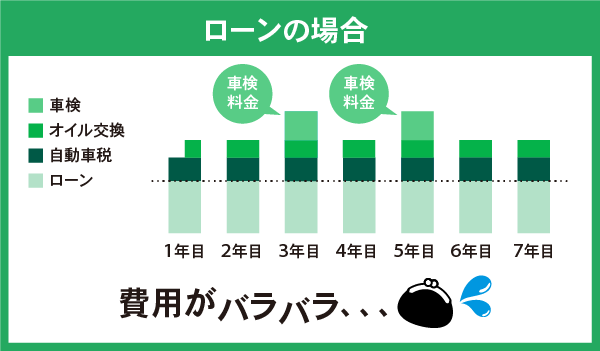 契約の形態が違うだけで、月々お支払いいただくことでは変わりありません。 オートローンと違い、将来発生する車検代金や、税金、メンテナンス費用なども含んだ上で均等にお支払いができるので、生活設計がしやすいです。