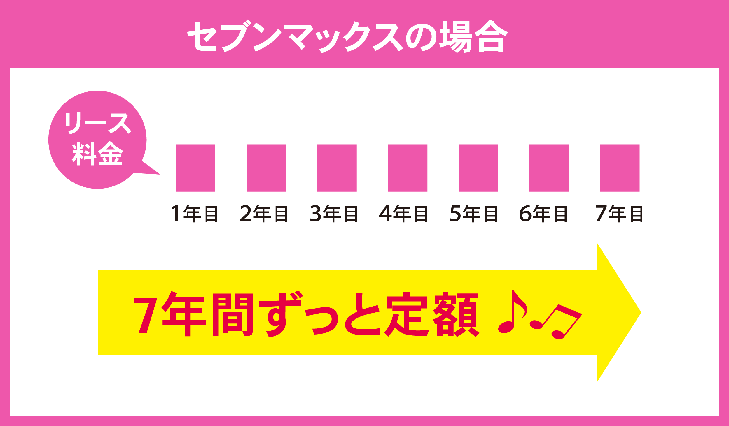 つじもと自動車取り扱いの『セブンマックス』は、毎月定額支払いだから、支払いが楽で家計にも安心。全車種から選ぶことができ、車体価格に加えて、オイル交換、車検、自動車税など、車にかかる7年間の基本費用がすべて含まれています。そしてリーズナブルに車に乗れる魅力的なプランです。