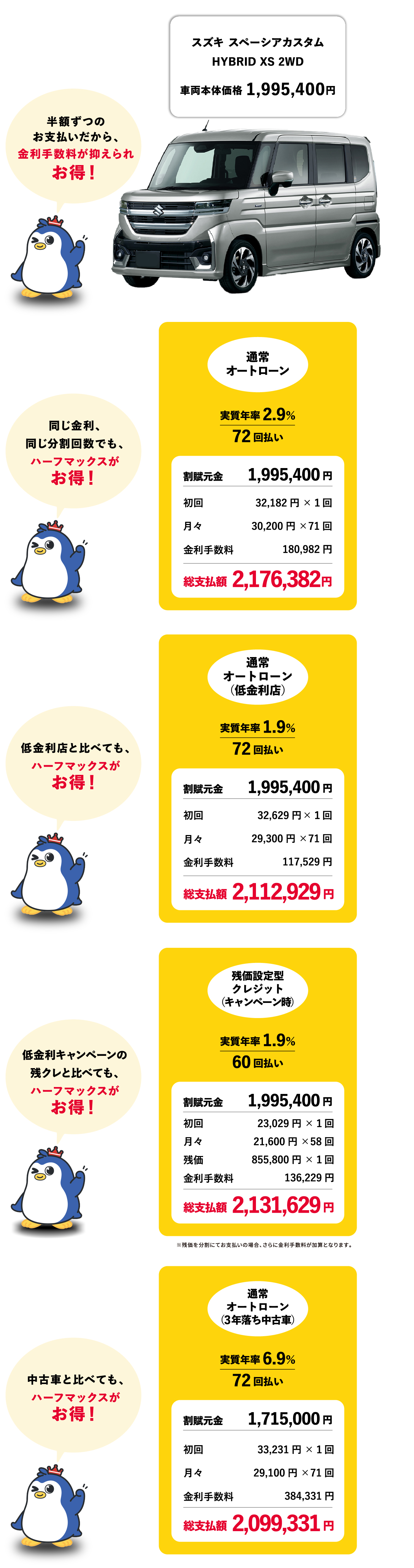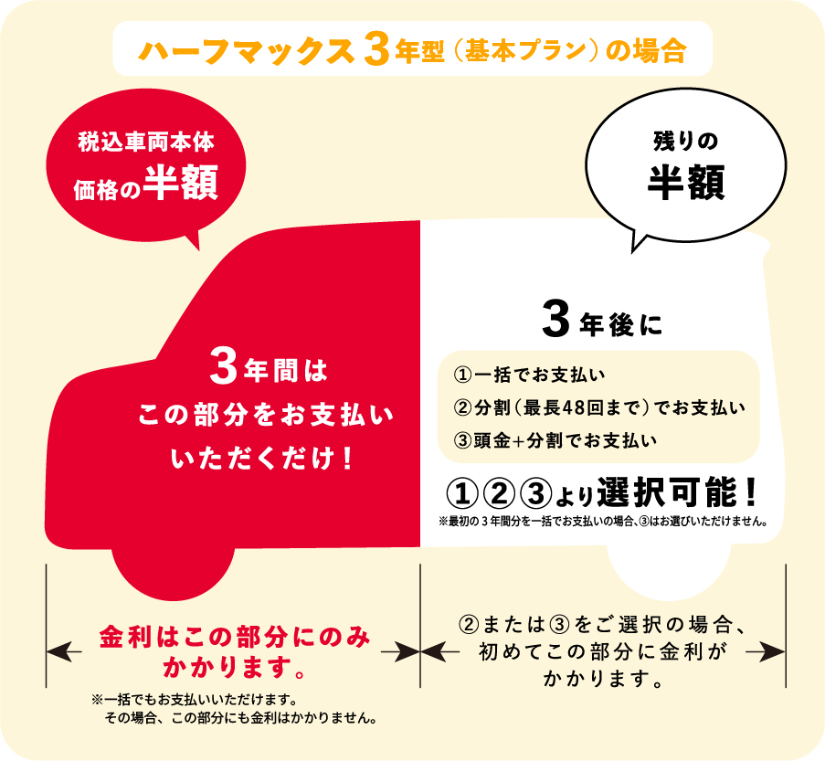 ハーフマックスは、税込車両本体価格の半額ずつをお支払いいただくことで、ローンの金利手数料を大幅に節約できるプランになります。